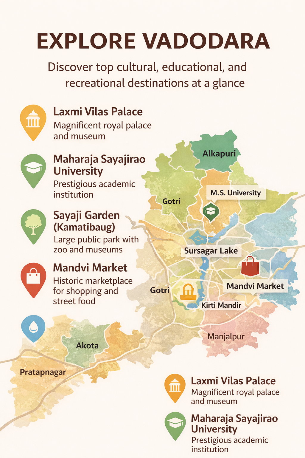 With well-planned infrastructure, affordable living, green spaces, and a peaceful environment, Vadodara offers a high quality of life. Blending tradition with progress, the city stands as a welcoming destination for residents, students, professionals, and visitors, making it one of Gujarat’s most balanced and livable cities.