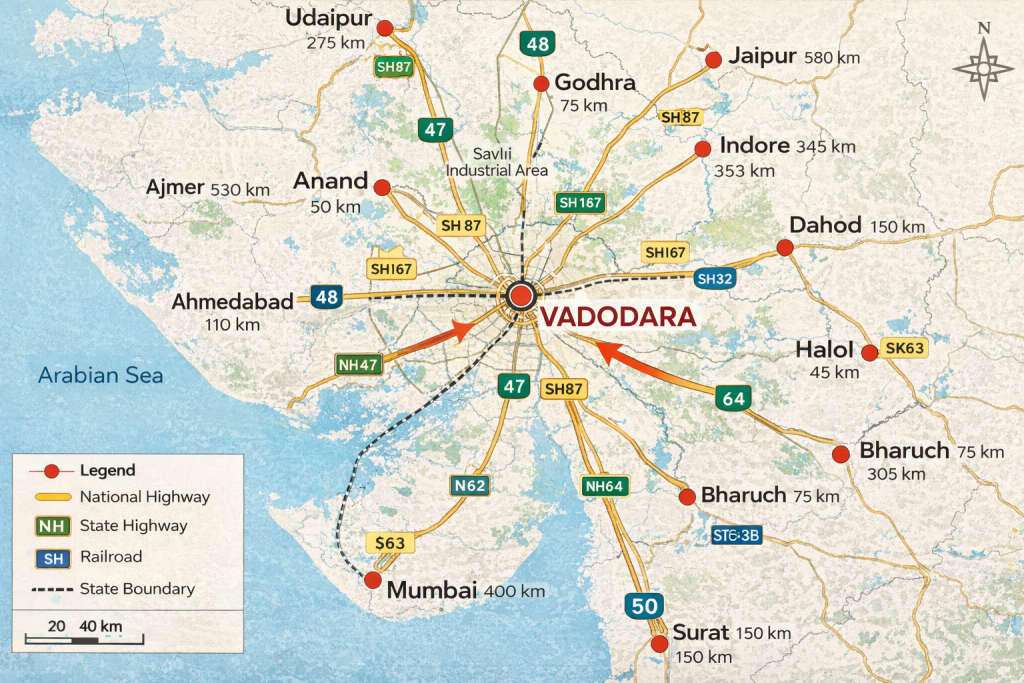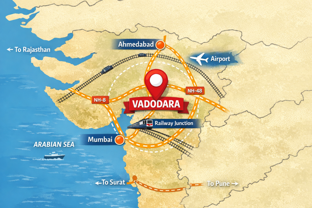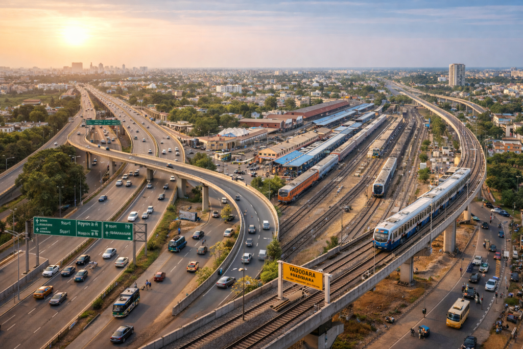 Vadodara is one of Gujarat’s most well-connected cities, supported by a strong and continuously developing transport and infrastructure network. Its strategic location between Ahmedabad and Mumbai places the city on major national and commercial corridors, making it an important hub for travel, trade, and industry in western India.