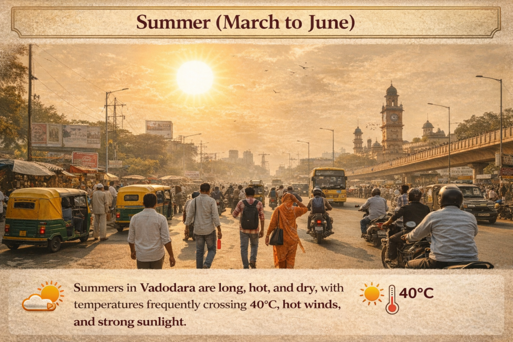 Vadodara experiences a tropical savanna climate with distinct summer, monsoon, and winter seasons. Summers, from March to June, are hot and dry, with temperatures often ranging between 35°C and 42°C. The heat is more intense during April and May, while early mornings and evenings remain relatively calmer.