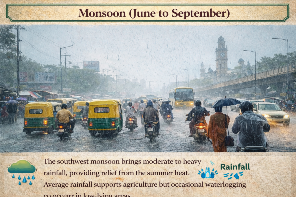 The monsoon season lasts from June to September and brings moderate to heavy rainfall, which helps reduce temperatures and adds greenery across the city. Rainfall supports agriculture, replenishes water resources, and improves overall environmental conditions, though occasional waterlogging may occur in some areas.